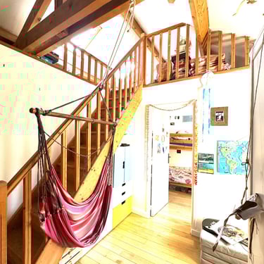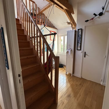 Des mezzanines à ossature bois ont été réalisées pour maximiser la valeur d'usage de l'espace de la maison et les menuiseries ont toutes été remplacées par leur version moderne écologique et performante en bois fournies par le groupe Janneau.